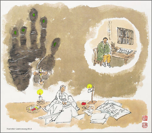 | ▲ 안중근 의사 어머니 조마리아 애국지사가 수의를 짓는 모습을 그린 시화에서(그림 이무성 한국화가) | ||