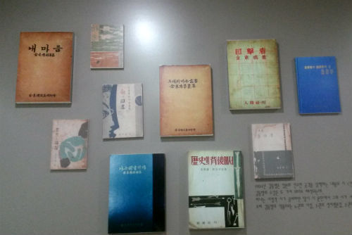 ▲ 벽에 전시한 김동명 시인의 책들