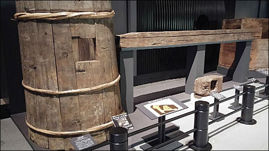 다시 에도박물관을 보자. 장수들의 대 저택 모형 몇 개와 에도시대를 그린 병풍 한 점, 그리고 장수가 사용한 가마 한 점이 전부인 6층 관람을 마치고 5층으로 이어지는 내부 에스컬레이터를 타고 내려가면 바로 에도 시민들의 물 공급원인 물 저장 통나무 재현과, 집에서 산모가 애기를 낳는 모습이 재현되어 있다.