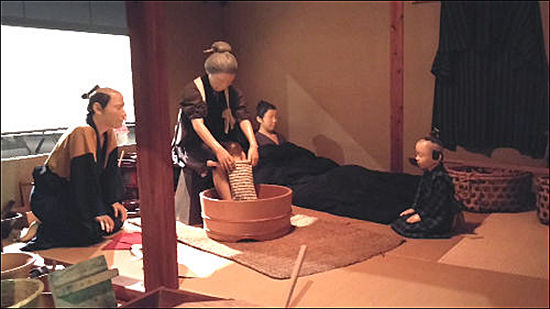▲ 집에서 출산하는 일을 산파가 돕고 있다. 갓 태어난 아기를 씻기는 장면이 재현 되어있다