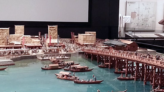 7층으로 된 에도도쿄박물관은 6층과 5층이 상설전시관이다. 1층에서 표를 사서 6층의 상설전시관으로 들어서면 니혼바시(日本橋)가 버티고 있는데 바로 에도로 들어가는 관문과도 같은 이 다리를 건너면 당시 에도성(江戸城)과 이 성에 살던 장수들의 집(屋敷, 야시키) 모형이 재현되어있다.