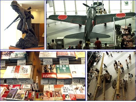 ▲ 총을 쥔 병사, 태평양전쟁에 쓰인 군용기, 살상무기 대포, 전쟁을 찬양하는 책들로 가득한 야스쿠니 유취관 모습 (왼쪽부터 시계방향)