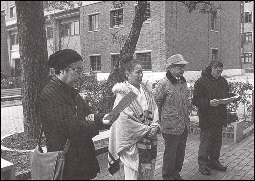 ▲ 교토 동지사대학 윤동주 시비 앞에서 2월 17일 추모회를 갖는 쓰노가이 선생, 한남수 선생, 세이노 여사, 모치즈키 선생(왼쪽부터)
