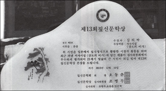 위는 일본 교토에서 발간되는 《한흙》제 55호에 실린 글이다. 《한흙》은 재일본한국문인협 회장인 김리박 시인이 주축이 되어 만드는 문예지로 1992년 창간 이래 올해로 22년째 발간하고 있다. 출판시장이 열악한데다가 더군다나 일본에서 한국의 얼과 정서를 잊지 않고저 이러한 문예지를 꾸준히 이어오고 있다는 것은 말처럼 쉽지 않은 일이다.