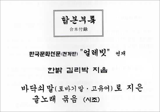 ▲ 인터넷 한국문화신문 '얼레빗'에 실린 토바기말(토박이말) 시조 모음 부록 표지