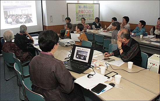 ▲ 월간 <부인통신>의 수준 높은 독자들에게 필자가 한국의 여성독립운동가를 이야기를 설명하고 있다 (2014.10.18 일본 도쿄 요츠야 전국교육문화회관 회의실 )