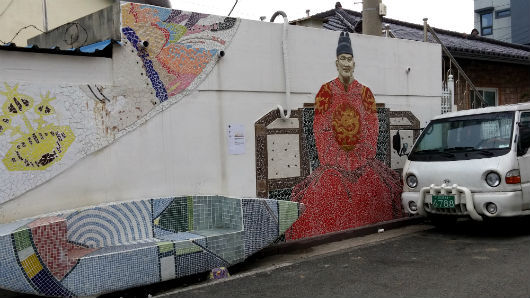 ▲ 페인트 칠이 아니고 모자이크로 작품 하나하나가 우아하다. 세종대왕 모습도 아주 잘 만들었다. 앞에는 긴 의자이다.