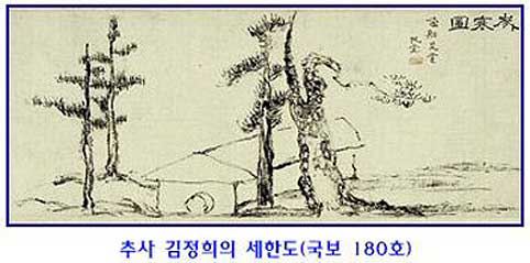 조선시대 문인화의 가장 대표적인 작품인 추사 김정희의 세한도(歲寒圖)는 초가 한 채와 지조의 상징인 소나무와 잣나무가 추운 겨울에 외로이 서있고 나머지는 빈 공간인 쓸쓸한 모습입니다. 이 그림은 1974년 국보 제180호로 지정되었습니다.이 세한도를 해방 직전인 1944년 일본인 수집가 후지즈카 지카시가 가지고 있었습니다. 이를 안 서예가 손재형은 연일 공습으로 아수라장이 된 도쿄의 후지즈카 집에 100일 간 날마다 찾아가 문안인사를 했습니다. 그에 감복한 후지즈카는 아무 조건 없이 세한도를 내주었습니다. 이후 62년 뒤 올 초 후지즈카의 아들 후지즈카 아키나오는 과천시에 추사의 미공개 편지 20점을 비롯한 문화재 3700여 점을 기증하고, 추사연구에 써달라며, 200만 엔까지 보냈다고 합니다. 일본엔 역사왜곡에 신사참배를 일삼는 파렴치한 일본 정치가만 있는 게 아니라 이런 양심가도 있었습니다.