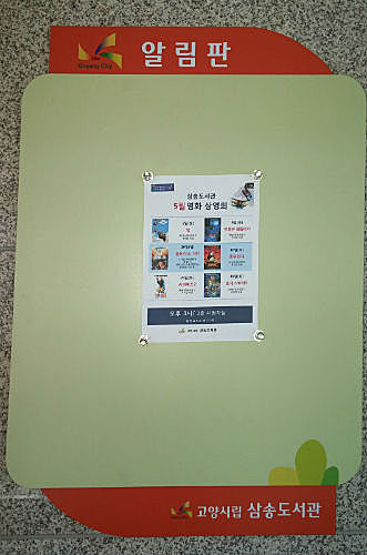 경기도 고양시 삼송동에 있는 '삼송도서관' 에는 '알림판'이라는 우리말로 새로운 소식을 알리고 있다. 아무 생각없이 어려운 한자말 '게시판(揭示板)'을 써대는 곳과 달리 읽기 편하고 쉬운 우리말이라서 더욱 좋다.