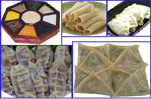 ▲ 유두 명절음식들(왼쪽부터 시계방향 / 구절판, 밀쌈, 상화병, 편수, 미만두)