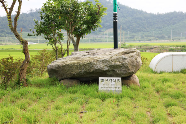 "백구는 1988년 의신면 돈지리 박복단 할머니집에서 태어나 1993년 3월 대전으로 팔려갔다. 그러나 늘 따사롭던 할머니와 손녀딸의 사랑이 그리워 백구는 새주인에 정을 붙이지 못하고 살았다. 그런 백구가 1993년 10월 자신의 목에 묶여있던 목줄을 끊고 탈출하여 300km 가 넘는 이곳 진도군 의신면 돈지리 옛집으로 돌아왔다. 이후 백구는 할머니의 따뜻한 품에서 살다가 2000년 2월 세상을 떠났다. 이에 의신면 돈지리 마을 주민들은 백구의 품성을 높이 기리고자 뜻을 모아 무덤과 비를 세웠다."