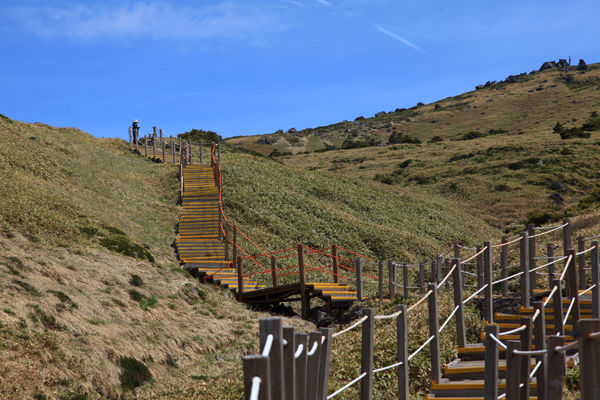 | 윗세오름에서 남벽분기점으로 가는 탐방로. 끝없이 이어지는 계단이다. 더 이상의 훼손을 방지하기 위하여 계단과 데크로 이루어진 탐방로 | ||