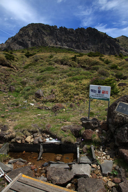 | 한라산 남쪽 사면에서는 맨 위에 있는 방아오름샘물. 옛날에는 여기서 마른 목을 축였을 것인데, 이제는 손발정도나 씻을 수 있다고 한다. 음용하지 말라는 경고팻말 !! | ||