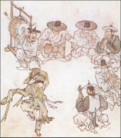 실제로 조선시대 단원 김홍도의 <무동(舞童)>이라는 그림을 보면 무동은 한삼을 뿌리며 춤을 추는데, 그 옆에는 6인의 연주자가 앉아서 반주하는 모습을 보게 된다. 이러한 악기 편성이 삼현육각이다.