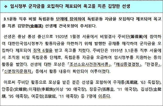 한편, 제101돌 3․1절 계기 포상자 중 주요 인물들의 독립운동 공적은 다음과 같다.