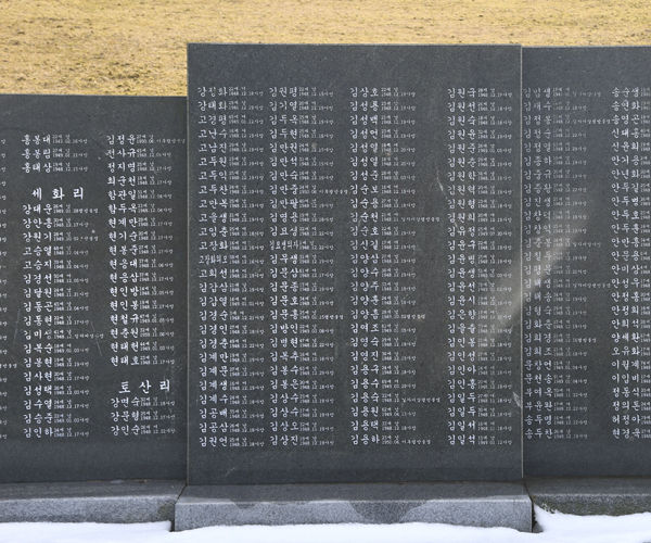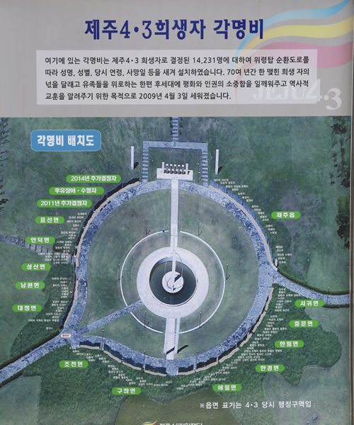 이는 제주 4.3 평화기념관 내 기념공원의 각명비에 새겨진 이름이다. 각명비(刻名碑)란 말 그대로 비석에 새긴 이름을 뜻한다. 이곳 각명비에는 제주 4.3희생자 14,231명의 이름과 성별, 당시 연령, 사망일 등이 적혀있다. 이 각명비는 지난 70여 년 동안 한 맺힌 희생자의 넋을 달래고 유족들을 위로하고 한편으로는 후세대에 평화와 인권의 소중함을 일깨워주기 위해 2009년 4월 3일 세운 것이다.
