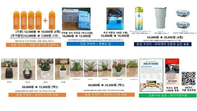 응원 꾸러미는 아름다운가게와 제주 감귤 농가가 함께 만든 ‘아름다운감귤주스’와 보호종료아동을 위해 설립된 사회적 기업 ‘브라더스키퍼’의 화분을 판매한다. 아름다운가게의 공익상품이기도 한 ‘아름다운감귤주스’는 결혼이주민 및 저소득 취약계층의 고용을 지원하는 제품이다. 건강꾸러미는 인천어촌특화지원센터가 지원하는 청정해역 장봉도에서 전통 재래방식으로 생산한 김으로, 이번 행사에서 할인된 가격으로 판매한다.