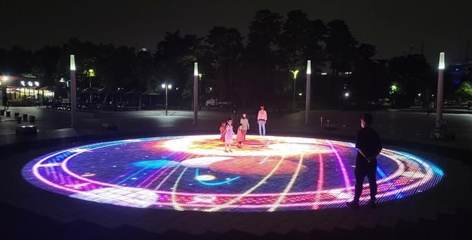 서울월드컵공원에 설치된 태양광 발전시설은 광장 바닥에 태양광·LED 패널을 매립한 지름 20M 규모의 원형무대로, 낮 동안 태양광 패널을 통해 에너지를 생산하고 야간에는 화려한 LED 영상예술을 선보인다.