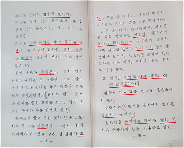 열째줄과 열한째 줄에 걸쳐 나오는 “전기는 어떻게 하여 우리 집에 들어오는가?”도 참 쉬운 월입니다. 여기서 쓴 ‘어떻게 하여’라는 말도 ‘어떤 경로로’ 또는 ‘어떤 과정을 거쳐’라고 쓸 수도 있는데 그렇게 하지 않았습니다. 그 아래에 이어서 나오는 ‘쓰고 있는’, ‘움직여서’, ‘일으키는’, ‘물의 힘‘과 같은 말도 쉬운 말이다 싶어 좋았습니다.