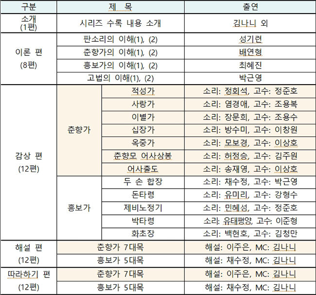 판소리 탐구생활, 해설과 함께 보는 그때 그 공연, 학예연구사가 들려주는 3분 국악, 교과서 국악
