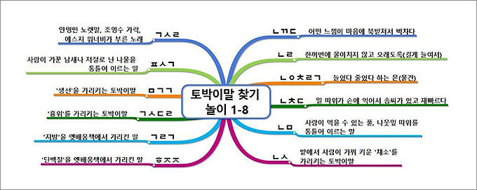 가볍고 맑은 몸과 마음으로 토박이말 살리기에 더욱 힘을 쓰겠다는 다짐과 함께 토박이말 찾기 놀이를 만들었습니다. 오늘은 토박이말 살리기 36~40까지 낱말과 옛날 배움책에서 캐낸 토박이말, 노래에서 길을 찾다에 나온 토박이말을 보태서 만들었습니다. 실마리로 보여 드리는 첫소리를 보시면서 토박이말을 떠올려 보시고 뒤에 있는 뜻을 보시고 다시 익히시기 바랍니다. 그리고 찾기 놀잇감에 흩어져 있는 토박이말을 찾아보신 다음 다 찾으신 것을 글갚음(댓글)으로 달아 주시면 고맙겠습니다.