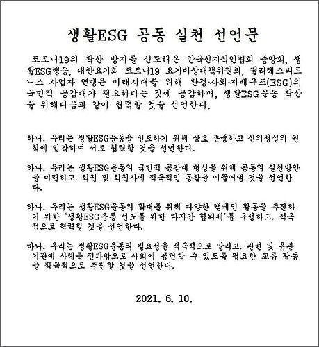 [우리문화신문=이나미 기자] 생활ESG행동은 6월 10일 오후 2시, 코로나19의 확산 방지를 선도해 온 한국신지식인협회 중앙회, 대한요가회 코로나19 요가비상대책위원회, 필라테스ㆍ피트니스 사업자 연맹과 생활ESG 확산과 국민건강 의제 발굴을 위한 공동 실천 선언식을 진행했다.