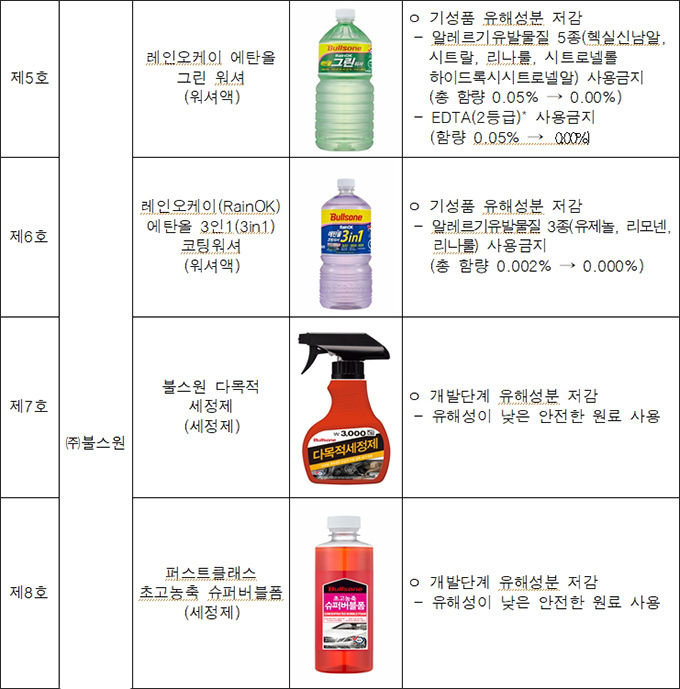 11개 우수제품은 △유한젠(표백제), △피지 딥클린젤(세탁세제), △홈스타 인덕션 클린티슈(세정제), △ 하이지아 다목적 살균 스프레이(살균제), △레인오케이 에탄올 그린 워셔(워셔액), △레인오케이 에탄올 3인1 코팅워셔(워셔액), △불스원 다목적 세정제(세정제), △퍼스트클래스 초고농축 슈퍼버블폼(세정제), △레인오케이 프리미엄 에탄올 발수코팅 워셔(워셔액), △슈맘(세탁세제), △공기청정기용필터1227815(필터형보존처리제품)이다.