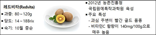 비타민 시(C)가 풍부한 키위 품종에는 과육의 중심부가 빨간 ‘레드비타(2012년 육성)’가 있다. 보통 키위에는 30mg∼80mg(생과일 100g 기준)의 비타민 시(C)가 들어 있는데, ‘레드비타’에는 140mg이 함유돼 있다. 1개만 먹어도 성인 하루 비타민 시(C) 권장섭취량(100mg)을 충족하는 데 충분하다.