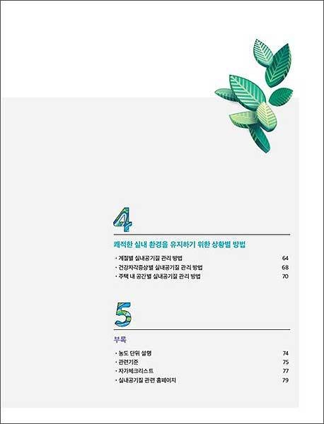 계절, 건강자각증상, 주택 내 공간별 관리방법 등 상황에 따른 정보를 제공하며, 자가 점검표를 통해 독자가 각 상황에 적합한 대처방법을 익힐 수 있도록 했다. 아울러, 실내공기 오염물질 종류와 실내공기질 관리방법을 연계하여 찾아볼 수 있도록 구성하여 독자의 편의성을 높이고 최신정보를 수록했다.