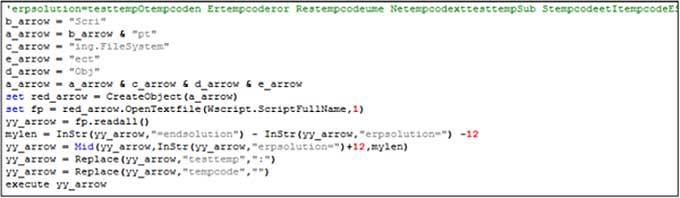 사용자가 첨부 파일을 누르면 악성 VB스크립트 파일이 personal.vbs 명으로 임시 경로에 생성하고 실행된다. 생성된 VB스크립트 파일 코드는 [그림 3]과 같이 난독화된 명령어를 주석처럼 표시한 뒤, 이를 다시 읽어 복호화한다. 그런 다음 악성 명령어를 실행한다.