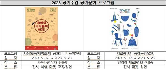 [우리문화신문=김영조 기자] 문화체육관광부(장관 박보균, 이하 문체부)는 (재)한국공예디자인문화진흥원(원장 김태훈, 이하 공진원)과 함께 5월 19일(금)부터 28일(일)까지 전국 각지에서 ‘2023 공예주간(Korea Craft Week 2023)’을 연다. 올해로 6회차를 맞이한 ‘공예주간’은 공예의 아름다움과 값어치를 국민에게 알리고 공예문화를 확산하기 위해 전시, 체험, 판매, 강연 등 다채로운 프로그램을 선보이는 공예문화잔치다.