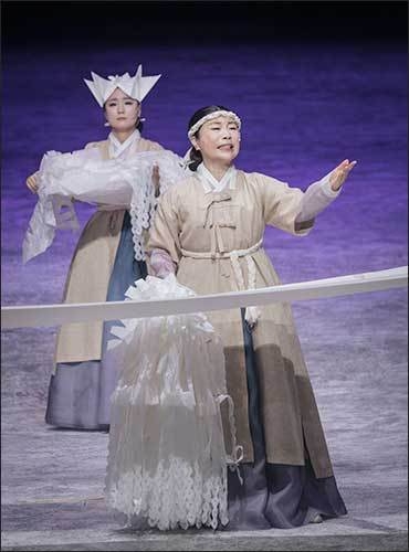 무대가 열리자 민속악단 유지숙 예술감독이 저 무대 뒤 한편에서 슬픔을 다 내려놓은 듯 처연하고 담담한 북녘의 소리 ‘제전’을 풀어낸다. <제전(祭奠)>이란 서도좌창의 대표적인 곡으로 한식 명절을 당하여 죽은 남편 무덤을 찾아가서 정성껏 제물을 차려놓고 제사 지내는 서도소리다. 그저 슬픈 것만도 아닌 담담하고도 깊이 있는 소리가 심금을 울린다.
