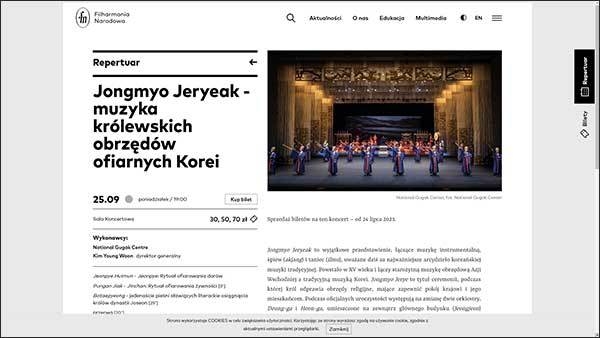 주폴란드한국문화원과 국립국악원이 하께 주최하는 폴란드 종묘제례악 공연은 바르샤바필하모닉홀의 시즌 공연 프로그램으로 뽑히면서 관객을 만나게 되었다. 바르샤바필하모닉홀은 2015년 쇼팽 국제 콩쿠르에서 피아니스트 조성진이 우승한 장소로 유명한 곳으로, 이번 ‘종묘제례악’ 공연을 통해 한국 전통음악의 정수를 전할 수 있는 특별한 계기가 될 것으로 기대를 모은다. 공연에 앞서 국립국악원은 7월 3일(월)부터 9월 23일(토)까지 종묘제례악 특별전시 ‘영원의 소리, 종묘제례악’을 주폴란드한국문화원에서 연다. 복식과 무구, 문헌 등 모두 27건의 유물을 전시해 종묘제례악의 이해를 한 층 높일 예정이다.