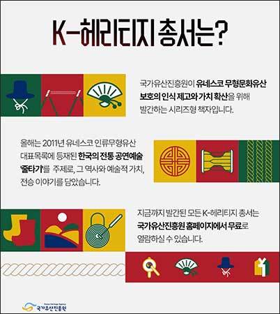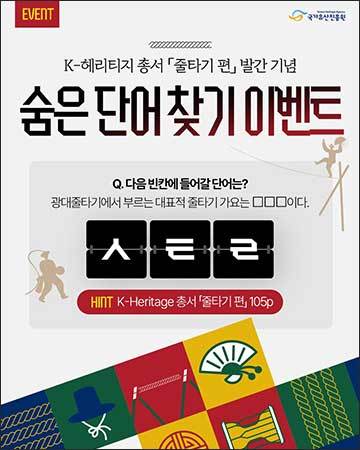 이번 온라인 버전 공개에 맞춰 누구나 참여할 수 있는 온라인 잔치도 11월 18일부터 12월 1일까지 진행한다. 이벤트는 유네스코 인류무형유산으로 등재된 ‘줄타기’를 보다 쉽고 흥미롭게 접할 수 있도록 기획하였다. 참가자에게는 추첨으로 소정의 상품도 줄 예정이다. ‘K-헤리티지 총서’는 유네스코 인류무형문화유산에 대한 인식 높이기와 대중적 확산을 위해 해마다 발간되어 ‘연등회’, ‘장 담그기’ 등 다양한 등재 종목을 소개해 왔다. 올해 발간된 〈줄타기〉 편은 2011년 인류무형문화유산으로 등재된 전통 공연예술 ‘줄타기’의 역사와 예술적 값어치, 전승 내용 등이 담겨 있다.