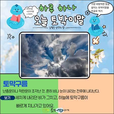 떠들썩하게 비가 쏟아지고 난 뒤, 혹은 펑펑 눈이 내리기 바로 앞의 하늘을 보신 적 있으신가요? 온 하늘을 덮었던 시커먼 먹구름이 거친 바람에 뜯겨나가, 이리저리 찢긴 채 어지럽게 떠가는 모습. 예쁜 조각이 아니라 어딘가 거칠고 볼품없이 잘려 나간 듯한 구름. 오늘 우리가 함께 나눌 토박이말은 궂은 날씨가 남기고 간 거친 숨결 같은 구름, '토막구름'입니다.