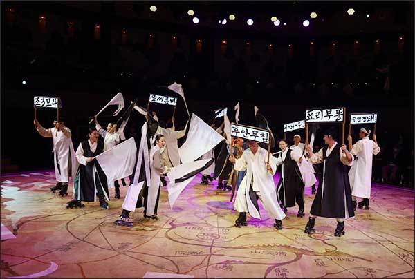또 ‘한국형 영웅’ 홍길동과 활빈당의 활약은 공중 활공(플라잉), 마술, 곡예(아크로바틱) 등 역동적인 무대와 함께 생생하게 펼쳐진다. 홍길동의 신묘한 능력을 관객 가까이에서 체험하게 해주는 마술 장면을 비롯해 홍길동이 적과 대결하는 매달기(플라잉) 연출 등은 무대와 객석을 가깝게 설계해 놓은 하늘극장의 묘미를 한껏 극대화하면서 극의 박진감을 더한다. 50여 명의 배우ㆍ무용수ㆍ연주자들이 무대를 가득 채우고, 노래와 연기, 곡예, 롤러스케이트 예술 행위까지 어우러져 시종일관 눈을 뗄 수 없는 장관을 연출했다.