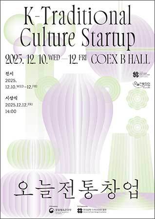 [우리문화신문=이나미 기자] 문화체육관광부(장관 최휘영, 아래 문체부)와 한국공예·디자인문화진흥원(원장 장동광, 아래 공진원)은 오는 12월 10일(수)부터 12일(금)까지 코엑스에서 열리는 지구촌 창업 잔치 ‘컴업(COMEUP) 2025’에서 전통문화 창업기업의 나라 안팎 판로확대와 투자유치를 위한〈2025 오늘전통창업 K-Traditional Culture Startup, 이하 오늘전통창업> 전시와 시상식을 연다.