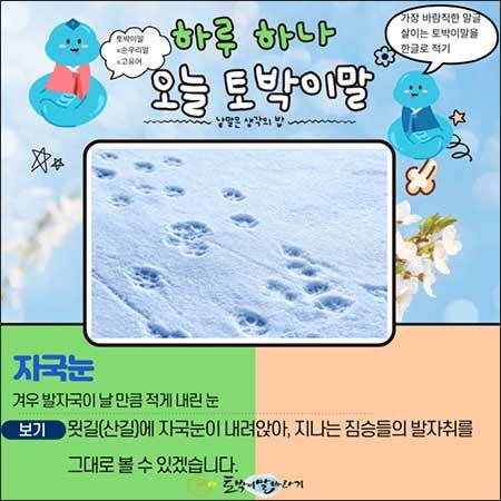 그렇다면 아름다운 이 말을 우리 나날살이(일상생활)에는 어떻게 쓸 수 있을까요? 먼저, 오늘 같은 날씨 기별을 할 때 딱딱한 숫자를 갈음해 이렇게 말해보면 어떨까요? "묏길(산길)에 자국눈이 내려앉아, 지나는 짐승들의 발자취를 그대로 볼 수 있겠습니다." '1cm 적설'이라는 말보다 짐승들이 지나간 자리가 눈 위에 꾹꾹 찍혀 있는 바람빛(풍경)이 훨씬 더 생생하게 다가올 것입니다.
