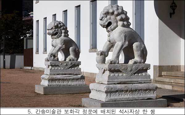 간송미술관에 따르면, 이 석사자상은 고 간송 전형필(全鎣弼·1906~1962년) 선생이 1933년 일본에서 경매를 통해 샀다. 당시 간송은 해당 석사자상 한 쌍과 함께 고려와 조선시대 석탑, 석등, 부도 등을 일괄 산 바 있다. 이후 석사자상은 1938년 간송미술관의 유물 전시장인 보화각(葆華閣)이 건립되면서 건물의 입구에 배치되어 현재까지 87년 동안 자리를 지켜왔다.