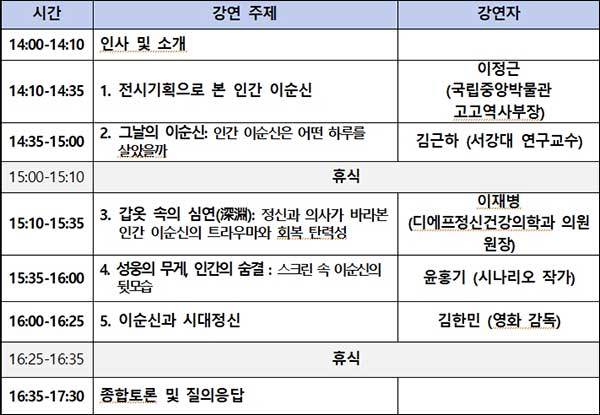 먼저 이정근 국립중앙박물관 고고역사부장이 ‘전시기획으로 본 인간 이순신’을 주제로 강연을 시작한다. 전쟁 영웅을 넘어 한 인간으로서의 이순신을 만나는 전시기획 과정을 소개하며, 특히 《난중일기》와 《임진장초》 등 이순신이 직접 남긴 기록을 중심으로 이순신의 내면과 감정을 어떤 방식으로 전시에 녹여냈는지 상세히 살펴본다.