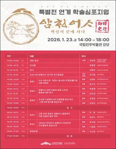 [우리문화신문=이한영 기자] 국립진주박물관(관장 장용준)과 조선시대사학회(회장 이왕무)는 2026년 1월 23일(금) 특별전 <암행어사, 백성의 곁에 서다> 연계 학술심포지엄을 함께 연다. 이번 심포지엄은 특별전 <암행어사, 백성의 곁에 서다>(2025. 10. 1. ~ 2026. 2. 22.) 관련 연구 성과를 공개하기 위해 마련되었다. 이는 2025년 6월 국립진주박물관과 조선시대사학회가 공함께 연 연구회 ‘조선시대 암행어사 연구의 종합적 접근’에서 소개했던 연구의 결과이다. 특히 조선시대 암행어사의 모습과 활동을 종합적이고 입체적으로 분석했다는 데 의의가 있다.