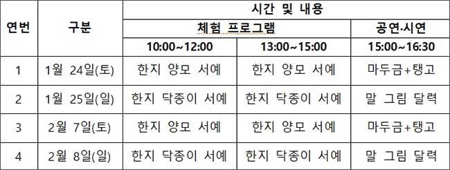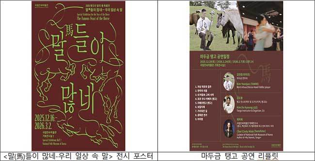 [우리문화신문=김영조 기자] 국립민속박물관(관장 장상훈)은 오는 1월 24일(토)~1월 25일(일)과 2월 7일(토)~2월 8일(일) 병오년 말띠 해 특별전 <말(馬)들이 많네-우리 일상 속 말> 연계 행사를 운영해, 겨울철 관람객들에게 특별한 문화 향유의 시간을 제공한다. 이번 행사에서는 몽골 전통 악기 마두금 연주와 함께하는 탱고 공연, 암행어사 마패 만들기, 대표적 말띠 인물인 다산 정약용의 명언을 마모필(말털로 만든 붓)로 써보는 체험 등을 경험할 수 있다.