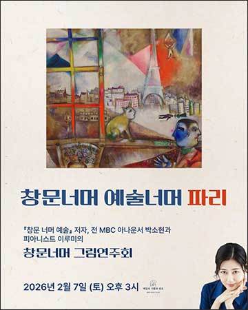 [우리문화신문=김영조 기자] 오는 2월 7일 낮 3시 서울 영등포구 국제금융로7길 3 수정상가 3층 310호 ‘매일의 기쁨과 위로’에서는 파리를 비추는 창문 그림들, 그리고 파리를 거쳐 간 음악가들의 이야기를 담아 <그림연주회>를 연다. 이 연주회는 전 MBC 아나운서이자 <창문너머 예술>의 저자 박소현 작가를 포청해 ‘북토크 X 청음회’ <창문너머 예술너머 쇼팽>으로 깊고 따뜻한 저녁을 선사한다.