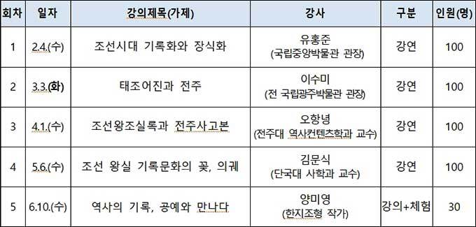 강좌는 2월 4일부터 6일 10일까지 모두 5회이며 낮 2시에 진행된다. 2월부터 5월 강좌는 대중강연으로 사전 예약과 현장 접수를 병행하며, 6월의 체험강좌는 2월~5월 수강자 가운데 신청자를 대상으로 선착순 모집한다. 프로그램 참가비는 무료며 자세한 내용은 국립전주박물관 누리집(https://jeonju.museum.go.kr/)에서 확인할 수 있다.