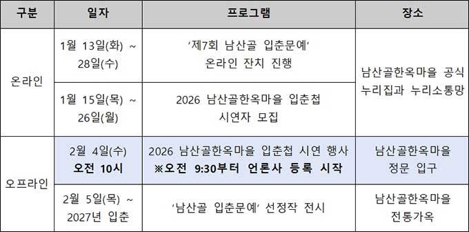 ❍ 때 : 2026년 2월 4일(수) 10:00~10:20 ❍ 곳 : 남산골한옥마을 정문 입구 및 온라인 ❍ 프로그램 : 입춘첩 부착 시연, 달력 나눔, 남산골 입춘문예 ❍ 주 최 : 서울특별시 ❍ 주 관 : 남산골한옥마을, (주)쥬스컴퍼니(남산골한옥마을) ❍ 문 의 : 남산골한옥마을 홈페이지 www.hanokmaeul.co.kr 02)6358-5533