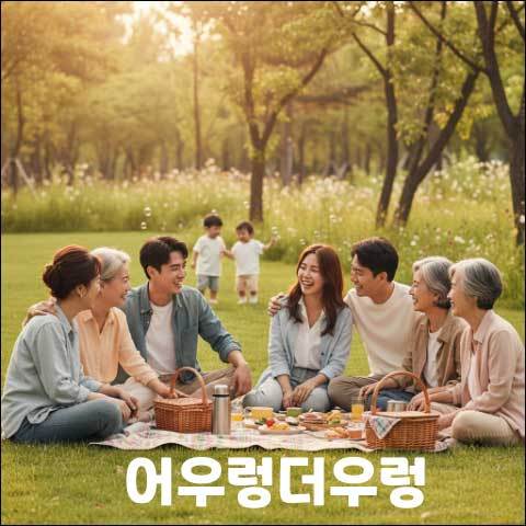 '어우렁더우렁'은 여러 사람이 한데 모여서 다 같이 즐겁게 지내는 모양을 뜻합니다. "어울리다"라는 말에 흥겨운 가락이 붙은 것 같지요? 마치 잔잔한 물결이 이쪽저쪽으로 부드럽게 넘실거리듯, 사람들이 서로 어깨를 맞대고 웃고 떠들며 하나가 되는 모습입니다.