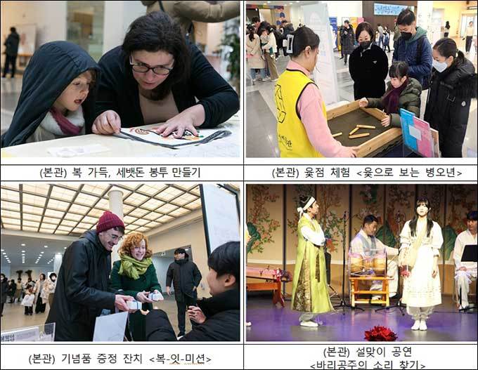 설 전시와 말띠 특별전 인증 사진을 통해 기념품을 받을 수 있는 〈복-잇-미션〉 증정 잔치, 복을 기원하는 설맞이 특별공연 〈바리공주의 소리 찾기〉 가족 소리극, 제기차기ㆍ딱지치기ㆍ팽이치기 등 전통놀이를 즐길 수 있는 〈소담 놀이마당〉, 설의 의미를 살펴볼 수 있는 영상 관람 등 설날의 즐거움을 풍성하게 담은 세시 프로그램이 관람객을 맞이할 예정이다. 특히 이번 행사는 ‘복은 혼자 받는 것이 아니라 함께 나누고 이어가는 것’이라는 메시지를 한가운데에 두고, 개인과 가족의 복이 ‘우리’를 거쳐 ‘이웃’으로 확장되는 복의 나눔을 제안한다.