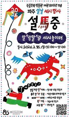 파주에서는 설 세시행사 〈설마馬중 – 말馬랑말馬랑 세시 놀이터〉를 운영한다. 이번 행사는 병오년 말의 해를 맞아, 설의 의미를 ‘말(馬)’과 ‘말(言)’로 알아보는 체험형 세시 놀이터로 구성했다. 설날에 덕담을 나누던 풍습을 바탕으로 한 수장고 연계 활동지 〈말馬로 완성하는 새해 덕담〉에서는 관람객이 말과 관련된 유물을 찾아 그 의미를 모아 새해 덕담 한 문장을 완성하게 된다. 활동지를 완성하면 떡국에서 착안한 설 기념품도 받을 수 있다.