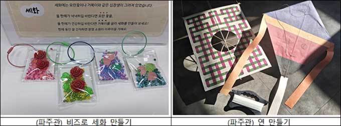 말랑말랑한 공예 체험도 마련된다. 말 모양 키링을 만드는 〈잘 될거란 말馬이야 키링 만들기〉, 길상무늬가 새겨진 떡살 스탬프로 연하장을 완성하는 〈좋은 말馬만 꼭꼭-연하장 만들기〉, 복조리, 복주머니 풍속을 현대적으로 풀어낸 〈복福 가득-라탄(나무줄기에서 채취한 가볍고 매우 거친 섬유) 복주머니 만들기〉, 비즈(구멍이 뚫린 작은 구슬)로 십장생도, 모란도 등 세화(歲畫)를 만들어 보는 〈해피happy 새해-비즈로 세화 만들기〉 등이 운영된다.