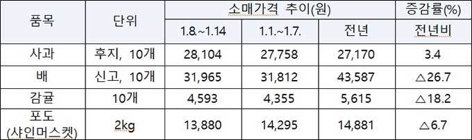 한편, 설 명절 과일 수급은 지난해 과일 생산 감소 폭이 크지 않아 전반적으로 안정적일 것으로 예상한다.*